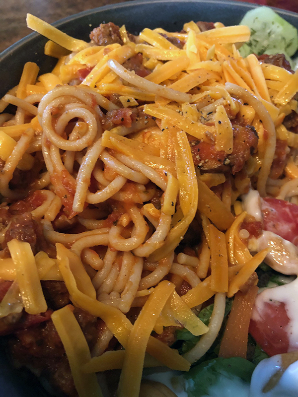 Heat oil over medium heat. Add Beyond Burger, mushrooms and spices. Cook until browned. Add spaghetti sauce and allow to simmer.