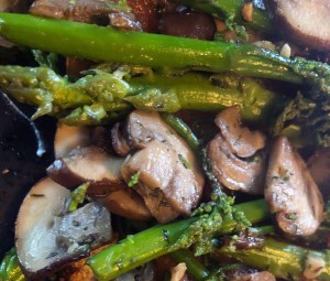 Top toast with cream cheese, and asparagus/mushroom mixture.