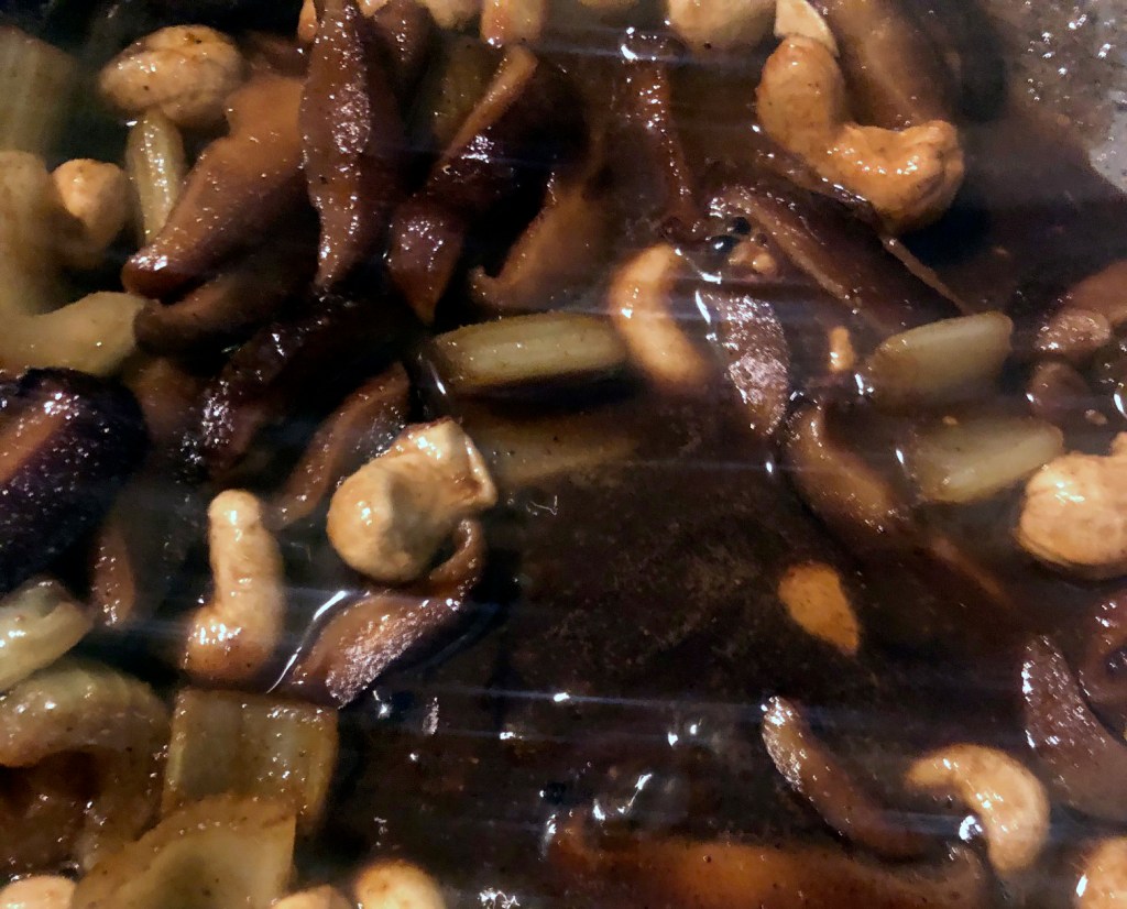 Heat oil over medium heat, add shitake and celery. Cook for approx. 4 minutes. Add water and bring to a boil. Add amino acids and vinegar. Return to a boil.