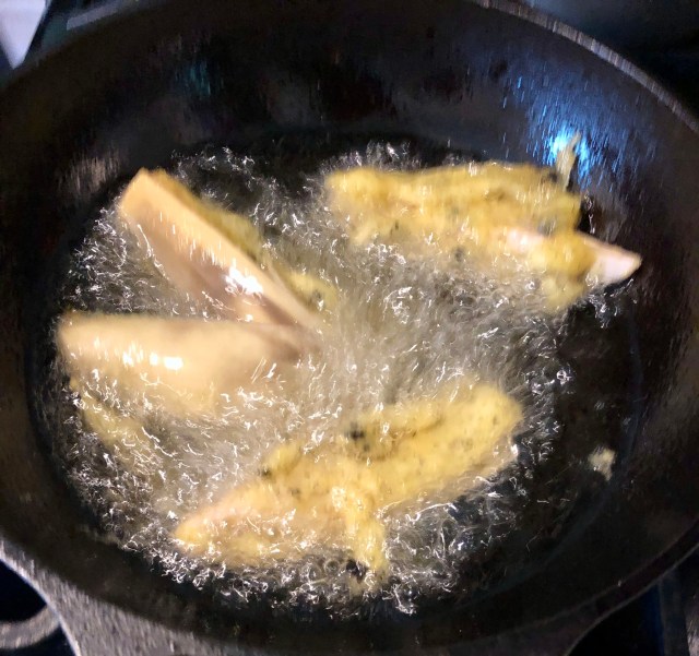 Dredge banana blossoms in dry batter first, then wet batter. Place only a few pieces in the hot oil and deep fry. Gently rotate fish pieces after about a minute.