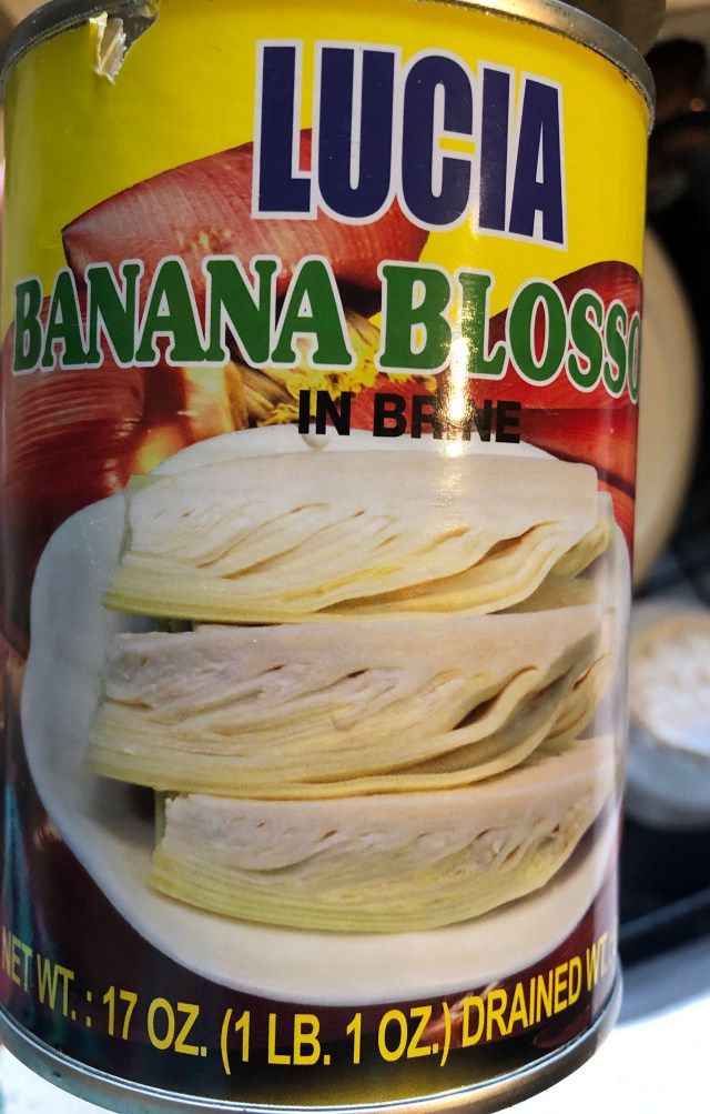 The fish is banana blossom, which you can find online. Note that it is packed in salt brine, so be sure to rinse it well before using it.