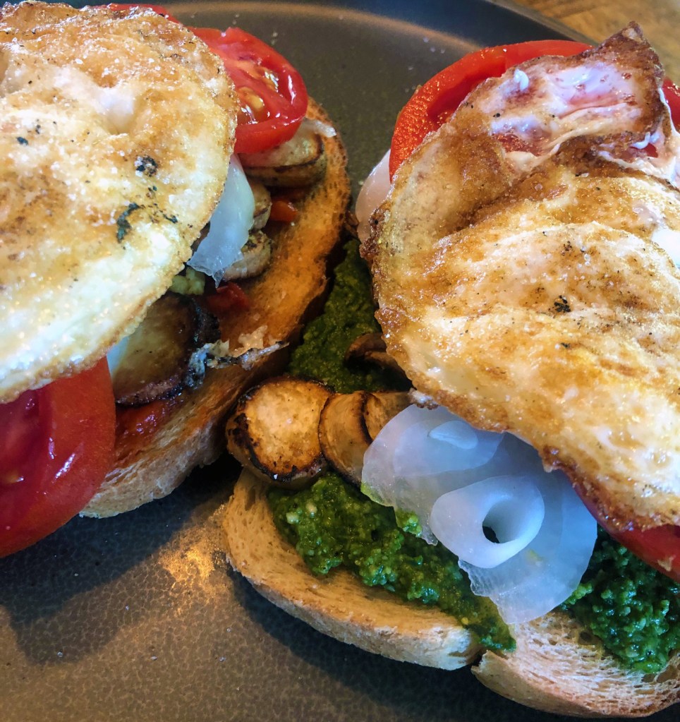Layer ingredients, using pesto as a spread on one piece of toast or bagel, and substituting harissa on the other.